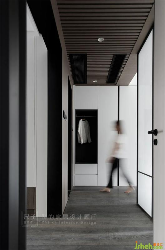 通往主臥的過(guò)道被靜謐的木色包裹,裝修設(shè)計(jì)從客餐廳到主臥形成自然地過(guò)渡,天花的格柵造型,進(jìn)一步豐富了空間的視覺(jué)表現(xiàn)。