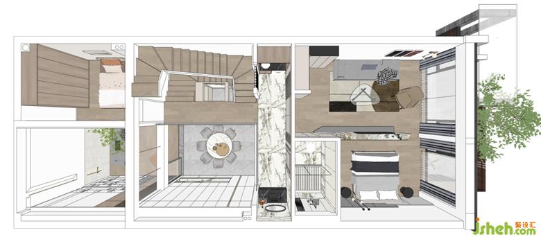 一層是客餐廚以及書房,打掉書房上面的樓層,做成采光井,來彌補(bǔ)一二樓采光差的問題。深圳聯(lián)排別墅設(shè)計(jì)通透的天井讓陽光無限照進(jìn),整個(gè)空間足夠開闊明亮。