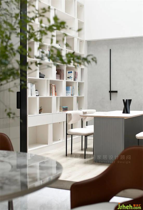 書房有一面從一樓一直頂?shù)蕉堑某髸?,?dāng)太陽光垂直灑落,書頁形成的光影,非常契合空間的浪漫氣息。