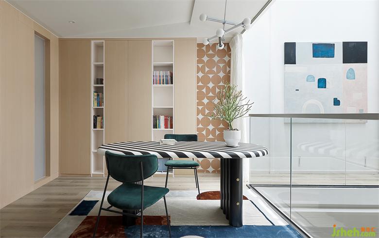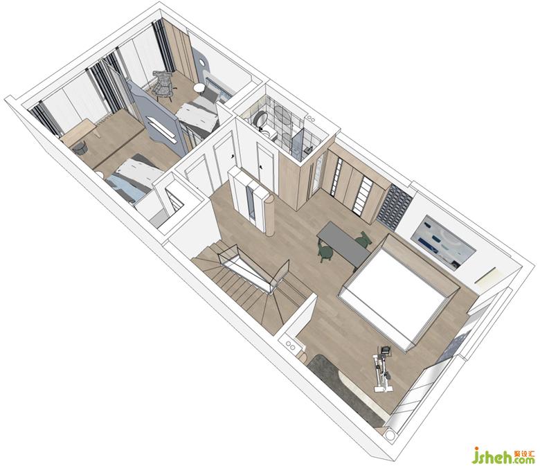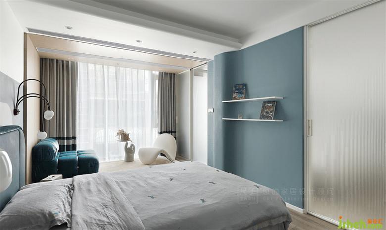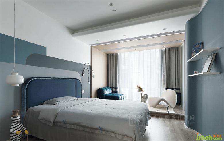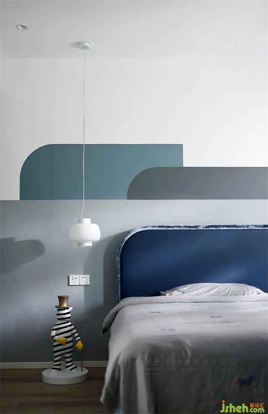 另一頭是孩子們的臥室,高級灰做底,藍(lán)色加以點綴,深圳聯(lián)排別墅設(shè)計色塊組合讓空間更具靈動層次感。