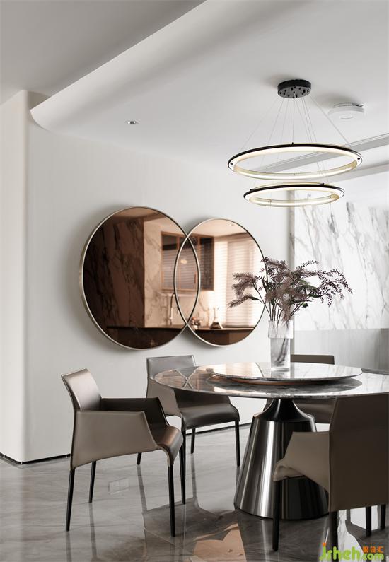 弧形線條遵循一定韻律延伸至餐廳,圓形元素在家具配飾上的運用,深圳家裝設(shè)計讓整體氛圍清冽的餐廳多了絲絲柔和的感覺。