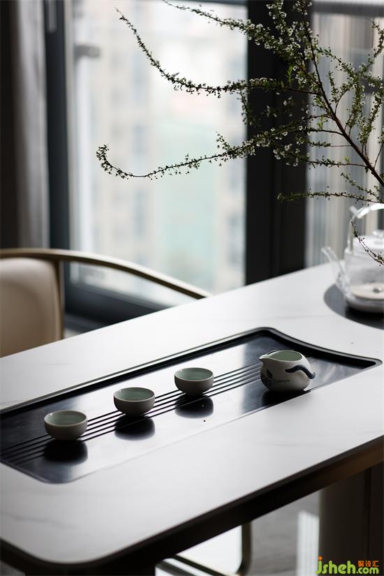 公共空間以淺奶咖色為主體色調(diào),遵循業(yè)主大家庭理念,將客廳、餐廳、茶區(qū)、西廚區(qū)相連的視覺特點,帶來闊達的空間尺度,加上大面積的落地玻璃,更顯大氣。
