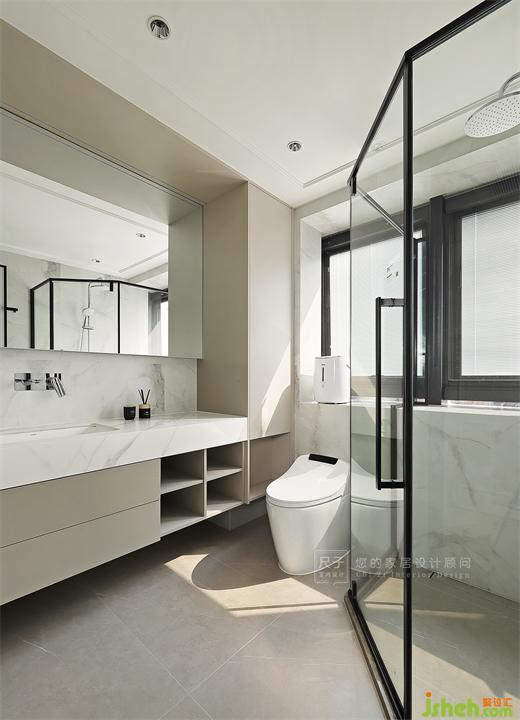 主衛(wèi)鏡子帶來空間的開闊感,墻面巖板飾面,深圳裝修設(shè)計極簡的色彩搭配,干凈又有高級感。