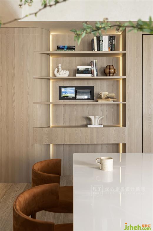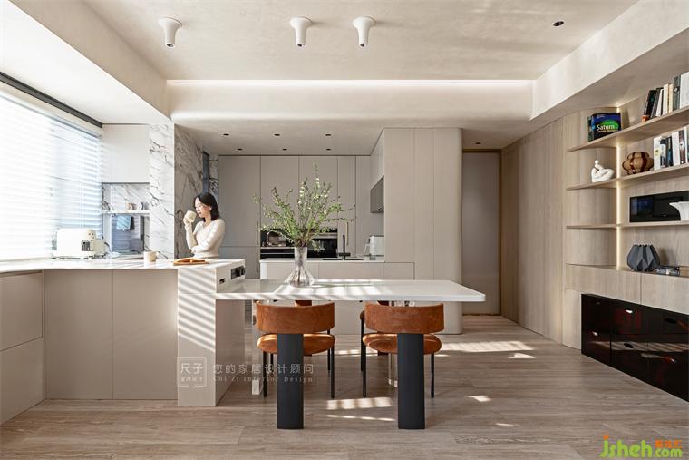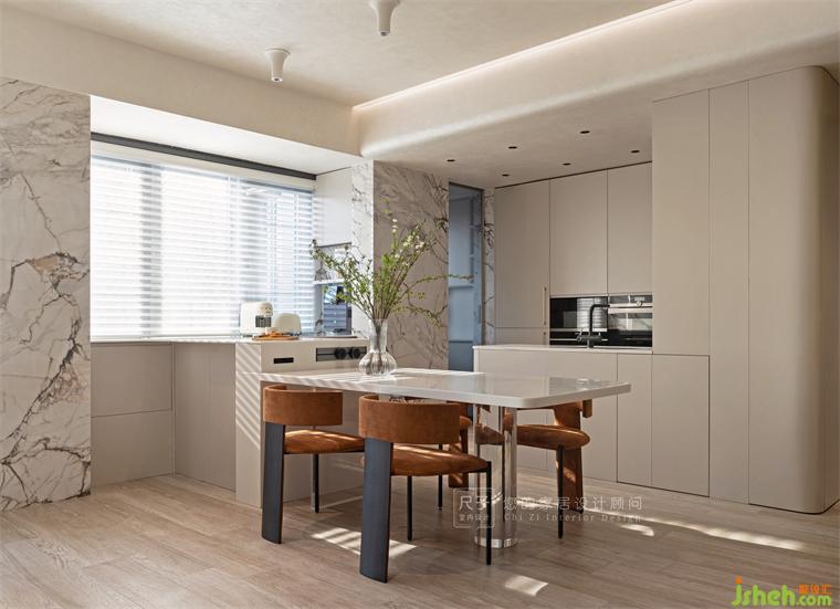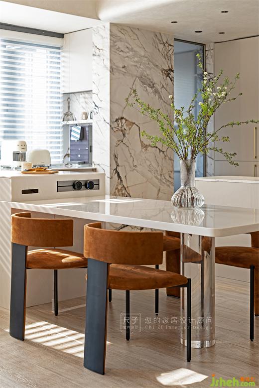 餐廳屬于橙色的那份美麗瞬間擴(kuò)散,巖板將優(yōu)雅大氣展現(xiàn)得淋漓盡致,百葉窗濾過的陽光形成的粼粼光斑讓用餐區(qū)顯得更有魅力,將溫馨值拉滿。