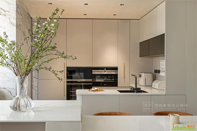 西廚和餐廳中間利用島臺(tái)進(jìn)行了分隔,裝修設(shè)計(jì)不經(jīng)意間成為了一體化的界線,又彼此交融,加強(qiáng)了空間的流通性。電器與柜體結(jié)合的形式整個(gè)空間整體統(tǒng)一,U型布局儲(chǔ)物功能強(qiáng)大。