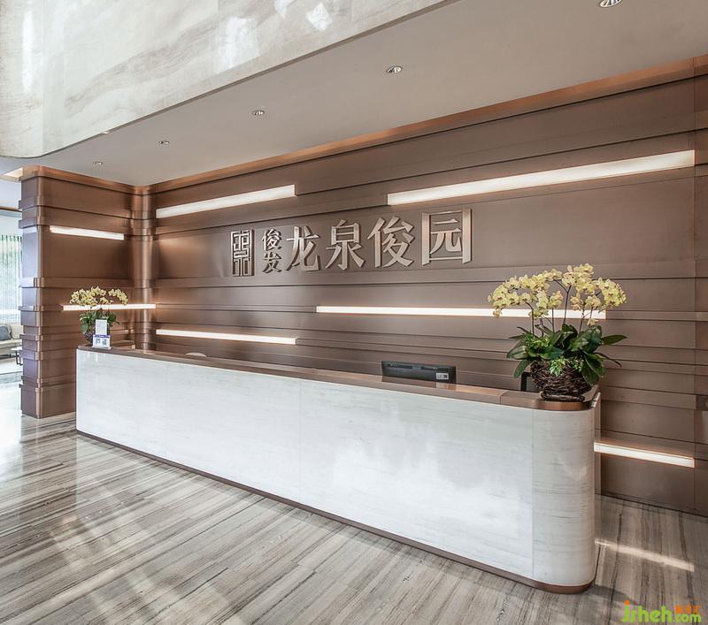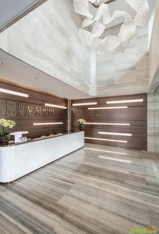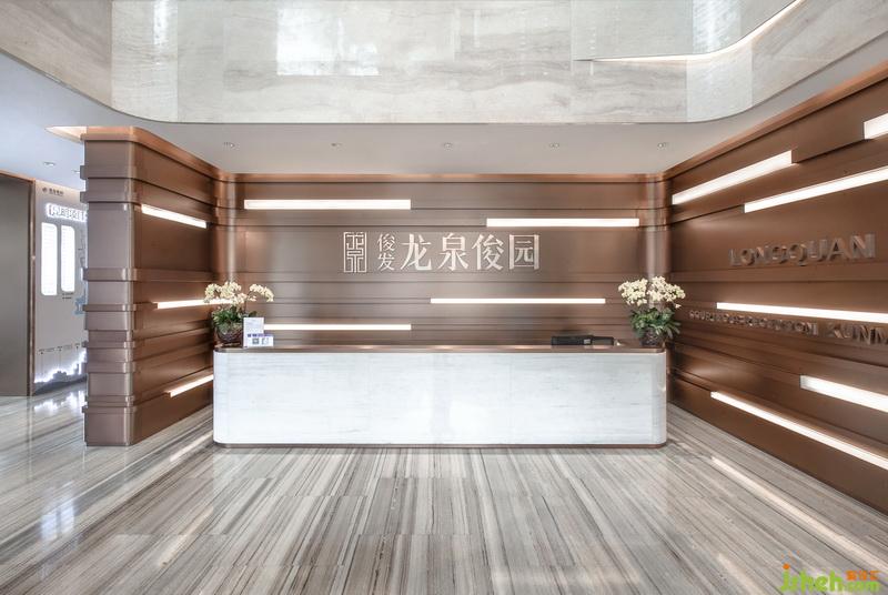 進(jìn)入售樓處前廳,俊發(fā)·龍泉俊園的字樣和營銷板塊的立體圖案映入我們的眼球,與同紋理的地面大理石相互呼應(yīng), 引領(lǐng)者賓客進(jìn)入大廳。