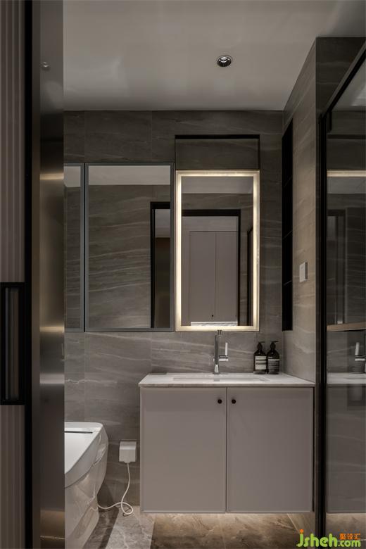 洗浴池上方嵌入方形鏡,周圈一抹亮光,與整體風(fēng)格相搭配,營(yíng)造出輕奢優(yōu)雅的氛圍感。燈光與金屬碰撞的浪漫光感,不同材質(zhì)的同聲表達(dá)流露出的氤氳觀感,凸顯國(guó)際范兒。