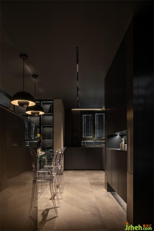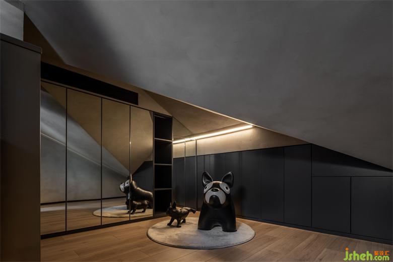 項(xiàng)目背景:原始戶型是頂層帶閣樓,我們打破原始的居住理念,融府裝修設(shè)計(jì)將主臥安排在二層的閣樓上,一層則留一間客房,供長輩或親朋偶爾居住。并將整體一層作為家庭娛樂的重要場所。值得一提的是,我們將原建筑結(jié)構(gòu)中的一層客廳與臥室空間互換,打破既定思維模式,讓規(guī)劃后的客廳與公共空間更和諧、動(dòng)線也更合理,同時(shí)也能兼顧樓梯的動(dòng)線與人體工學(xué),讓去往二層的樓梯空間更舒適、更安全。在色彩應(yīng)用方面,我們結(jié)合業(yè)主喜好選擇了深灰色系,高品質(zhì)的凝現(xiàn),加之金屬不銹鋼和清水混凝土的運(yùn)用,為空間增加不同質(zhì)感的生命力、精氣神。每一件小物都經(jīng)過精挑細(xì)選,只盼物有所愛,人有所歸。