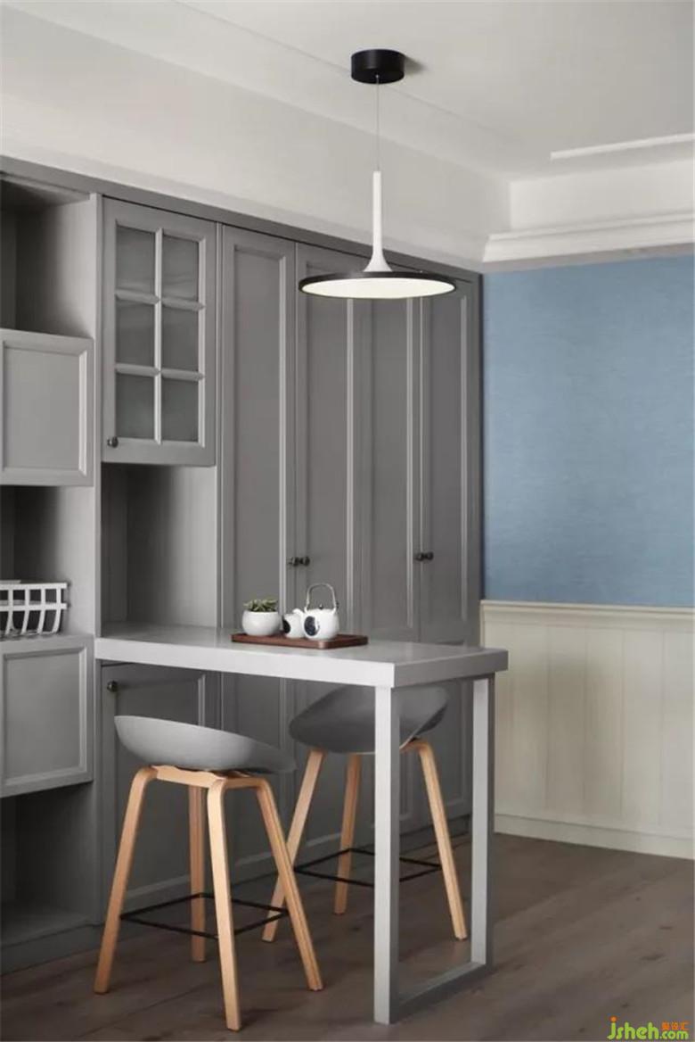 室內(nèi)設(shè)計(jì)師另設(shè)了一個(gè)吧臺(tái),將它延展出來。三言兩語(yǔ),淺酌一杯,掃去一天的疲憊。暖黃色的射燈把光芒漫灑下來,燈光下你的剪影真好看。