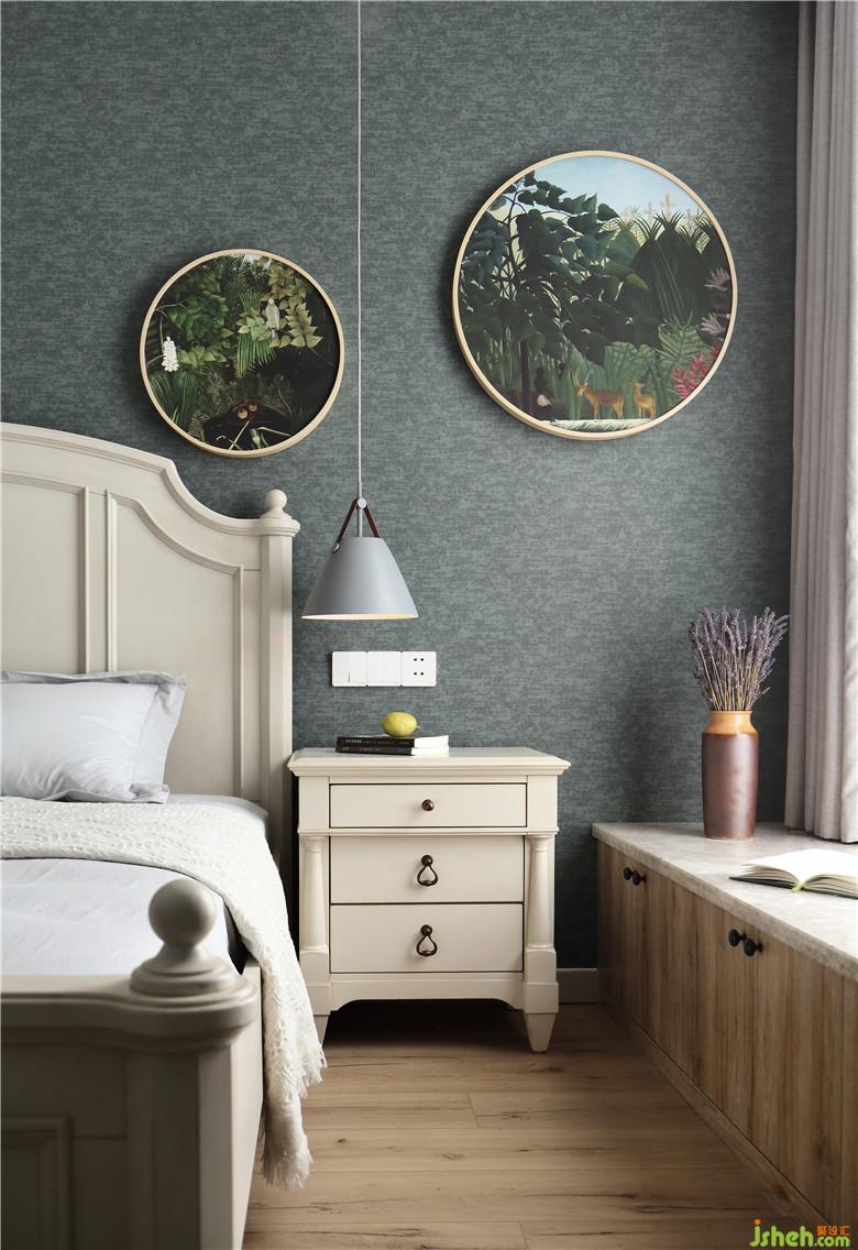 臥室墻紙室內(nèi)設(shè)計(jì)師選用了灰綠色,而家具則以白色銜接,并與地板的木色形成柔和的過渡,讓整個(gè)畫面融洽起來,帶來一種經(jīng)歷生活洗禮的溫暖氛圍。