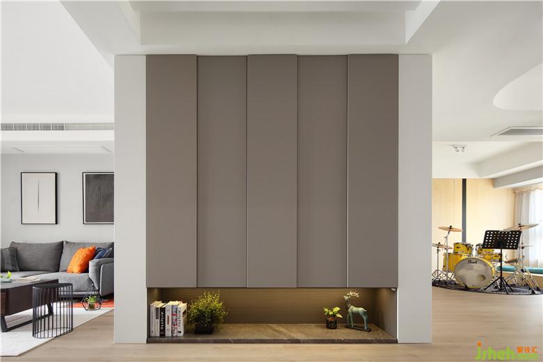 大門正對面看似一面裝飾墻,實為一組隱藏的柜門,內部是一個很實用的次凈衣收納柜和鞋柜收納的結合,使用后的隱形門完全隱入墻體之中,成了一面沉靜的墻。