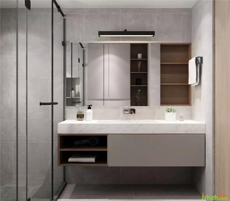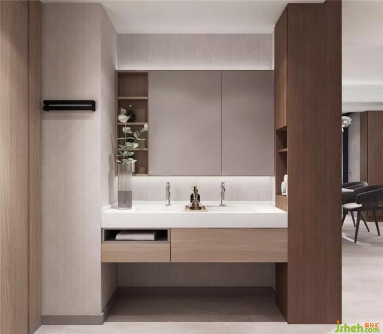 懸空式的衛(wèi)浴潔具,保證視覺上的寬闊感。嵌入式的收納設計,依照居住者的生活習慣,合理規(guī)劃,將空間極致利用,不動聲色地提升生活的品質。
