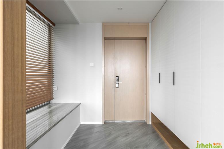 室內設計師入戶打造整面透氣的木質百葉窗與大面積衣帽鞋柜形成體量的對比,白色+灰色+木色的交織融合營造干凈利落的入戶空間。