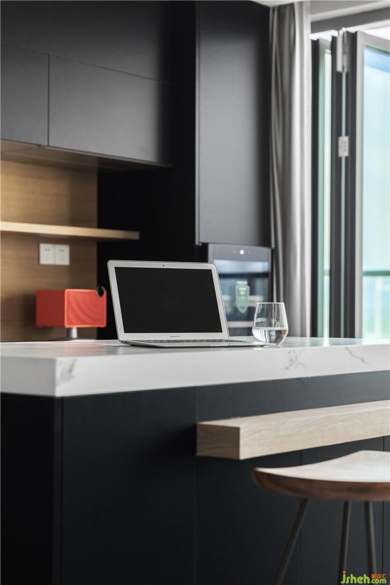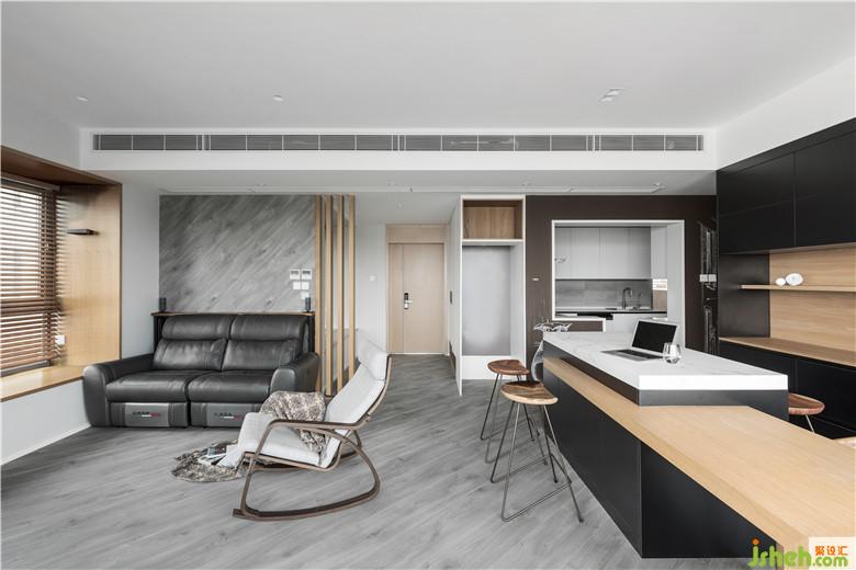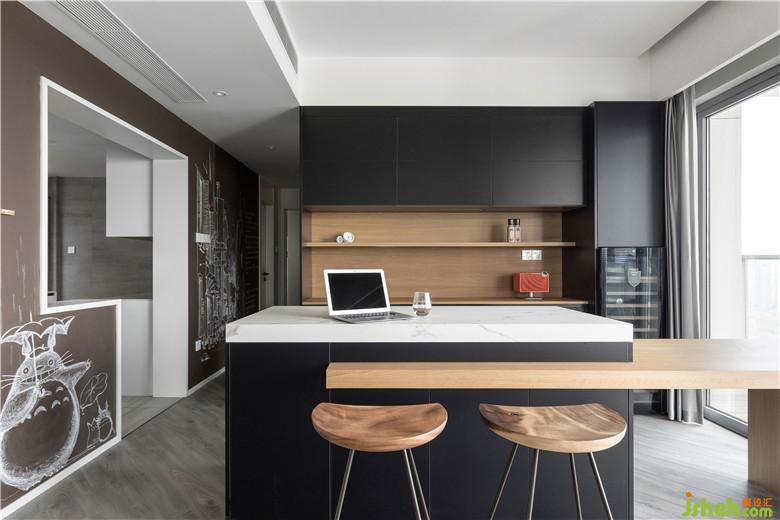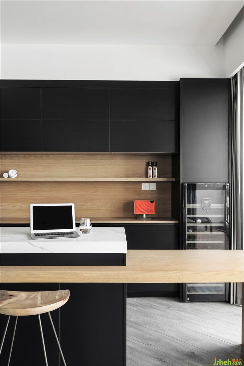 回歸生活,放下忙碌,約二三知己,小酌數(shù)杯,分享屬于在家可感受到的寧靜與愜意;室內設計師使用中島的黑色與木色搭配直接碰撞,太多會比較生硬,咖啡色黑板墻的位置以及面積都起到一個中和作用,它不僅承上啟下,也包容著硬朗的黑白灰之間撞入一份木色暖意,不凝重卻足夠有血有肉。
