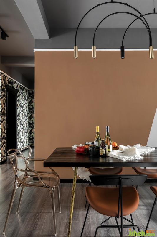 餐廳有一定的局限性,既是動線通道,又是功能區(qū),我們將左右墻面進行了顏色區(qū)分的視覺引導,太妃糖褐色是介于棕褐色與沙漠色之間,黃度減弱,又不至于過紅,是復古中性色的一員,有一種輕熟的優(yōu)雅,并帶有一種視覺溫暖,沉郁醒目的同時也毫不張揚,墻面褐白相搭,緩解了往常的單一疲勞,亦將通道與主墻體進行不動聲色的區(qū)分。