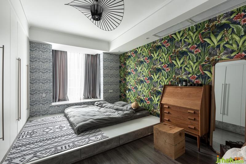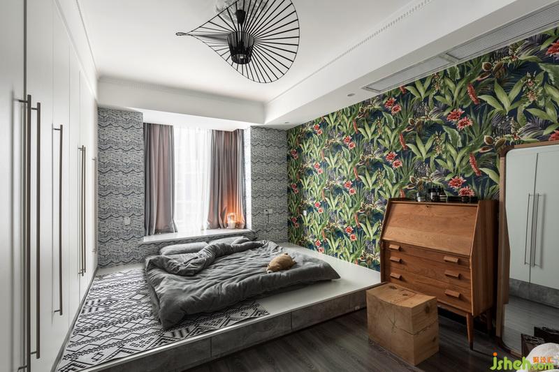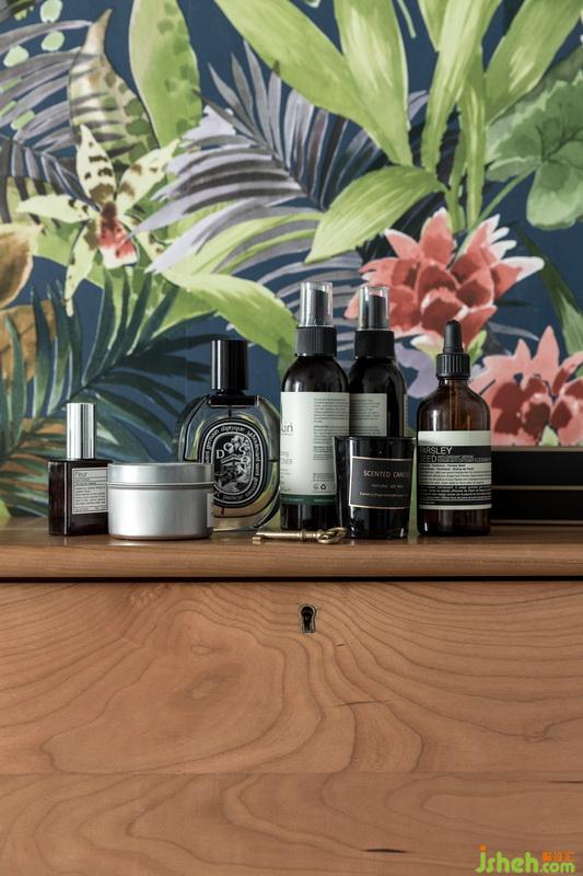 植物墻紙延續(xù)了客廳的叢林感覺,溫潤的櫻桃木在材質(zhì)上將其打破進行對比。