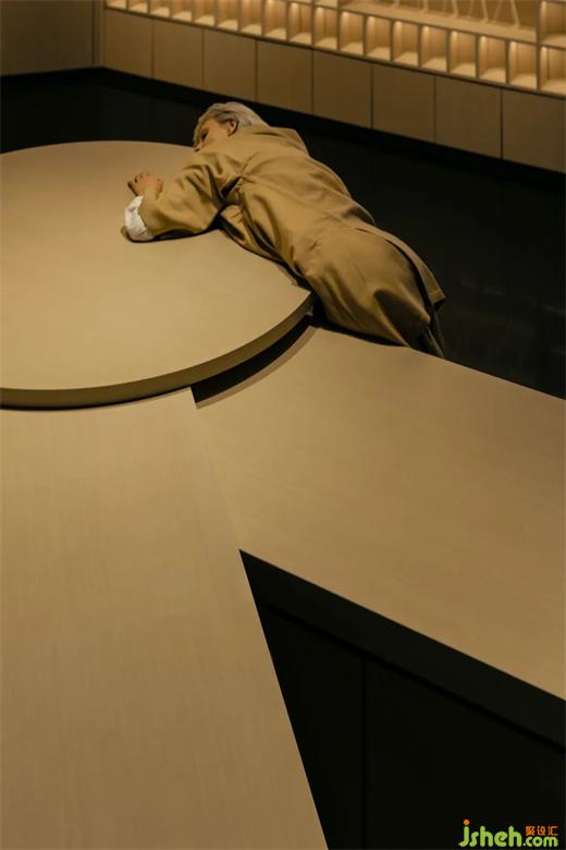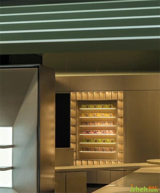 真正置身于內(nèi)部時(shí),一抬頭映入眼的是綠色的異形頂面,仿若一片碩大的葉子,旗艦店設(shè)計(jì)從四周頂立交接處開始由低到高一直延伸到距地面五米處的滅點(diǎn),與頂部最高點(diǎn)的光源完美相接并融為一體。頂部的冷光,配著四周燈帶所散發(fā)出的暖光,使整個(gè)空間層次感和立體感十足,如幻境中的場(chǎng)景一般。