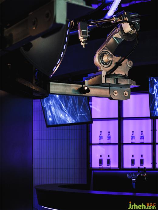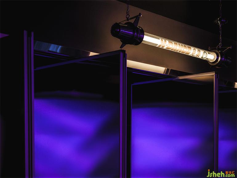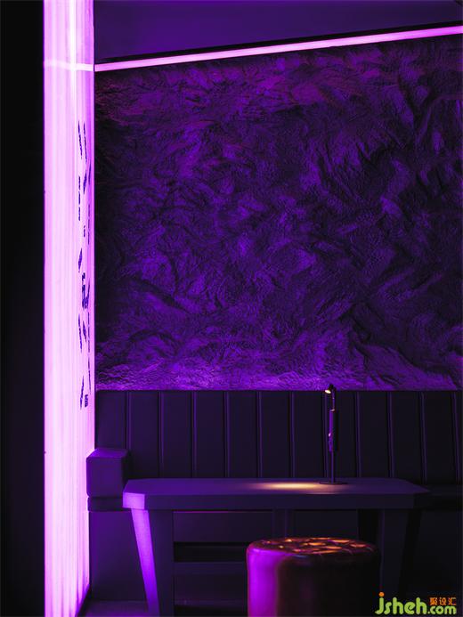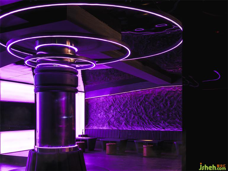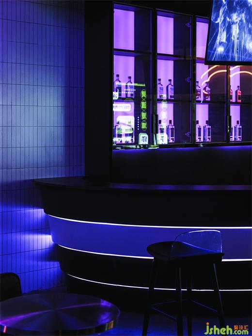 吧臺(tái)區(qū)的LED燈帶利用動(dòng)態(tài)的數(shù)字內(nèi)容快速提升空間氛圍和娛樂趣味,作為點(diǎn)綴的金屬構(gòu)架在霓虹燈的映照下,俱樂部設(shè)計(jì)帶有來自未來的機(jī)械美感。部分吧臺(tái)主體采用玻璃磚堆砌而成,平衡了輕盈與厚重之間的美感,將霓虹光吸納其中。