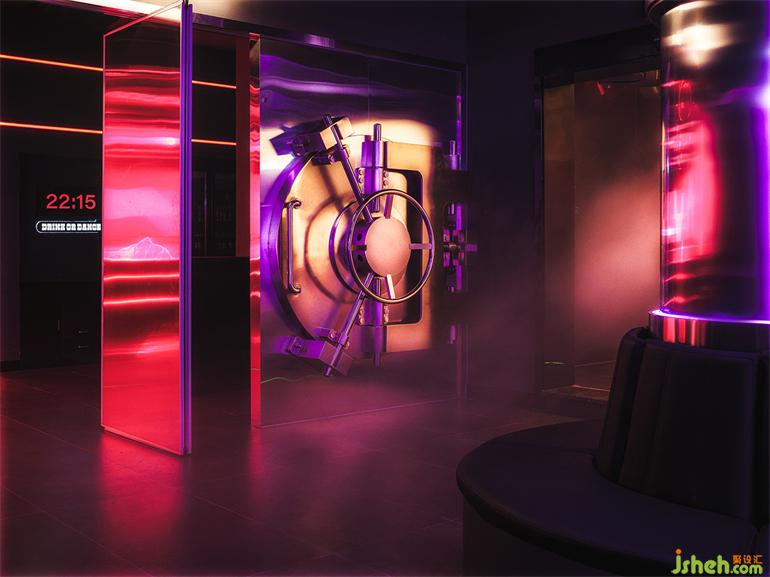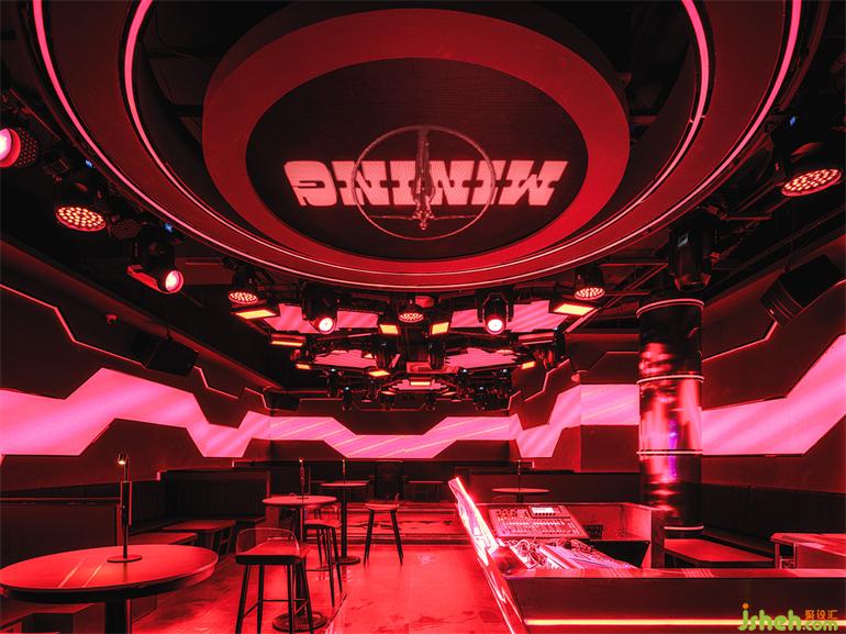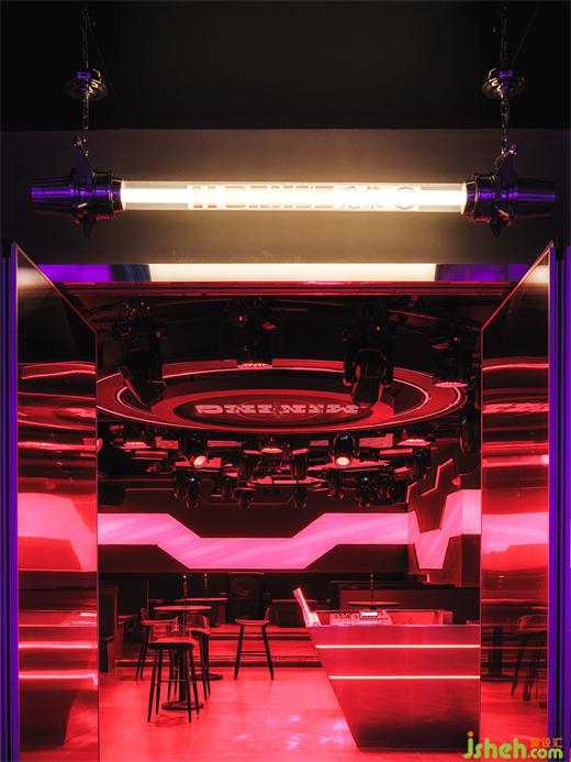 從吧臺(tái)一側(cè)走入交互通道,通道盡頭的鐳射裝置射出紅色光束勾畫出空間輪廓,俱樂部設(shè)計(jì)并在地上投射出相應(yīng)信息,同時(shí),從上而下的光束為路過的客人創(chuàng)造出與空間之間的互動(dòng)更多形式。