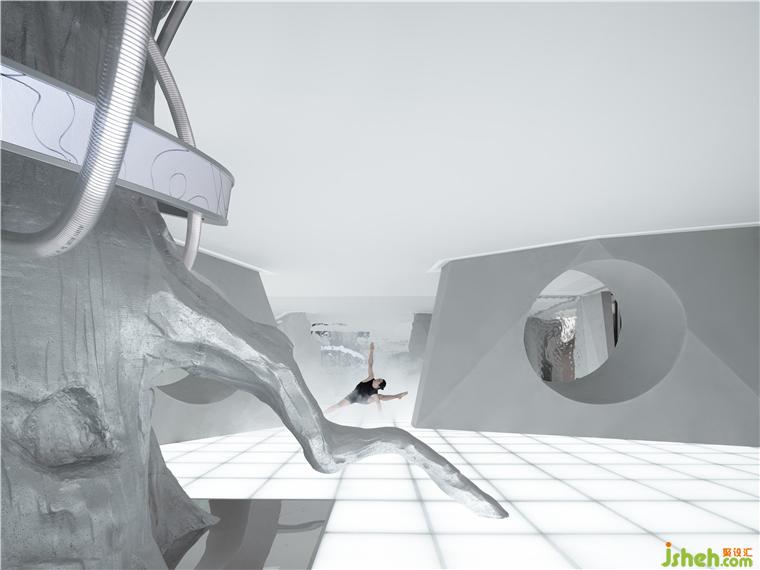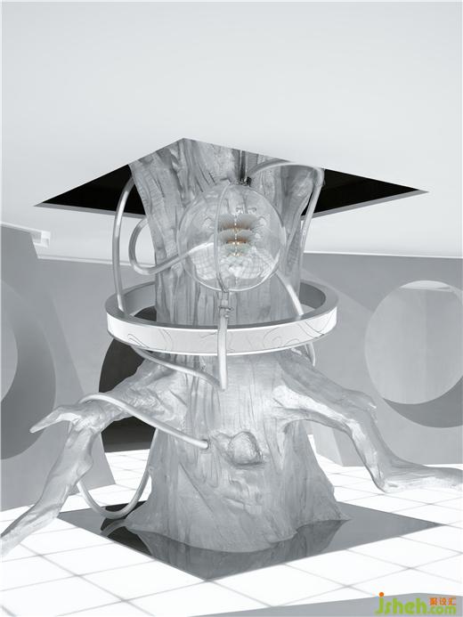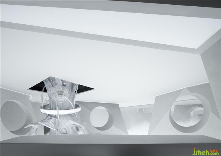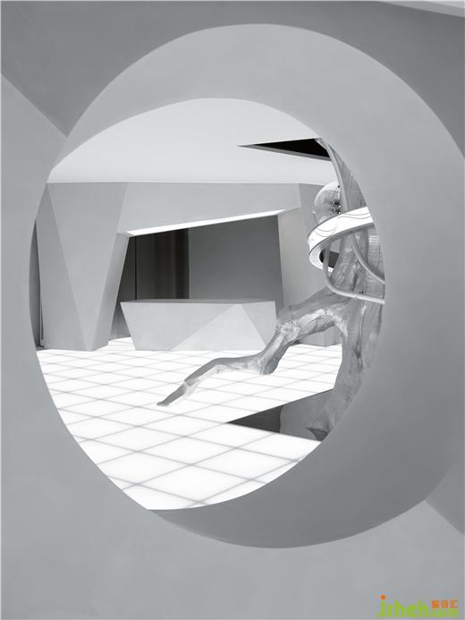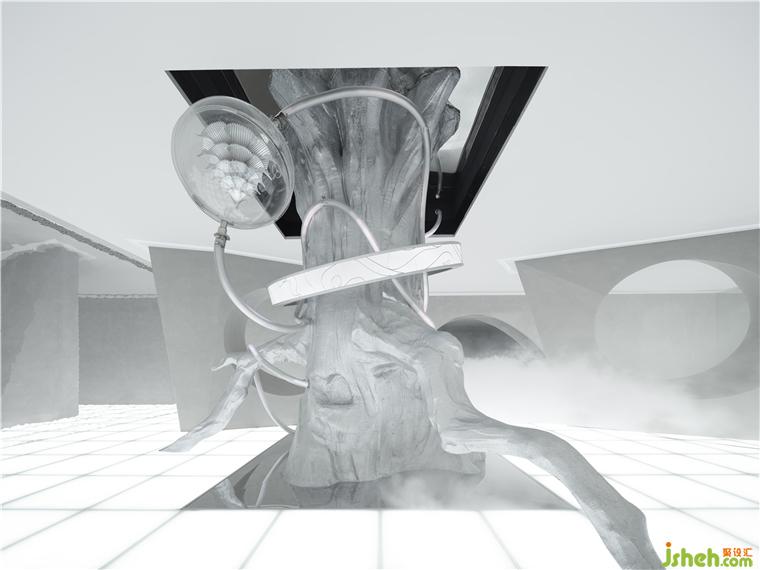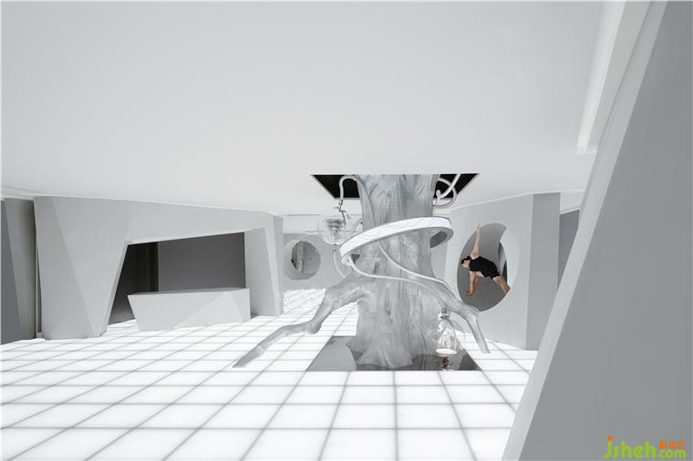 驚喜與意外觀感也隨之而來,一棵穿過天花板的大樹,它究竟要通往何處——或許是另一個平行世界,總是引人無限遐想。美術館設計未來感造型環(huán)繞在樹周圍,自然與科技的結合尤為驚艷,猶似蔓藤與走獸的燈飾裝置纏繞而上,抽象的藝術概念效果即刻達成。
