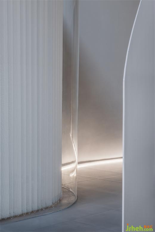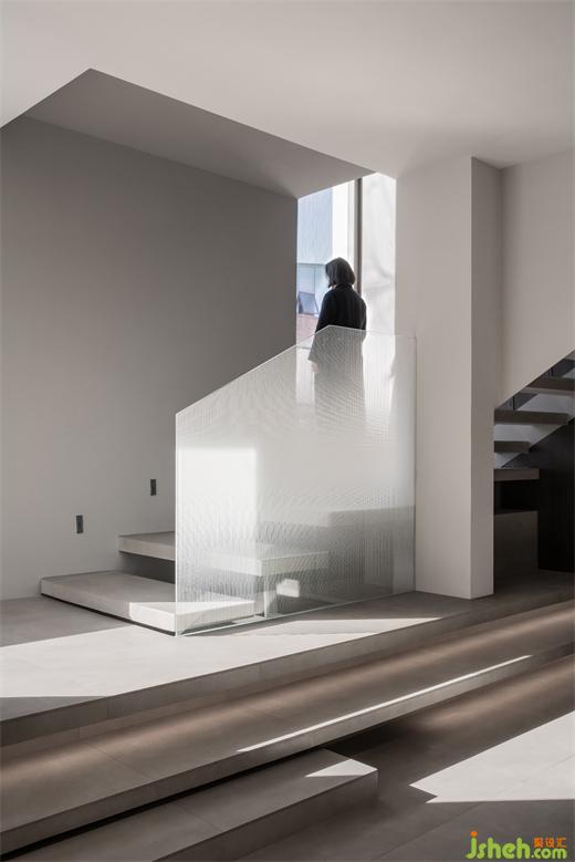 從入口處,經(jīng)過一段狹長的走道后逐漸走入,此時(shí)需要下探幾步才正式踏進(jìn)豁然開朗的開放高挑的室內(nèi)空間,若繼續(xù)拾階而上,可以直達(dá)二樓的會(huì)客茶室之中。