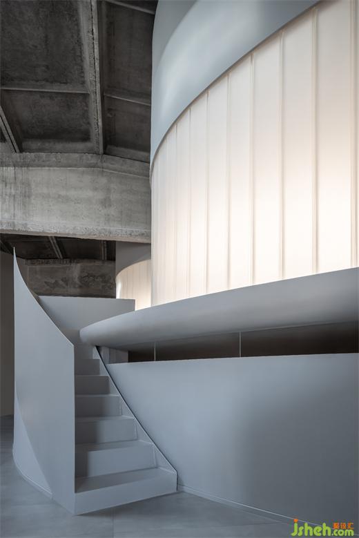 一層環(huán)形空間做了下沉處理,猶如古典音樂廳一般的空間關(guān)系,為進(jìn)入多增添了幾分儀式感,而外部環(huán)繞的樓梯又像一條帶人們從中心處直通二樓的快速通道。