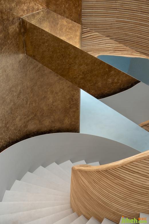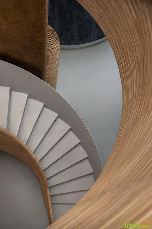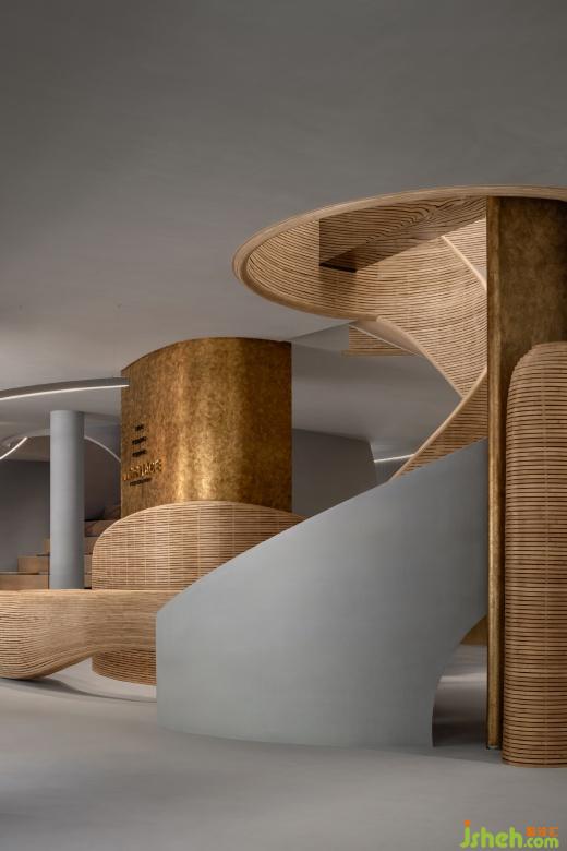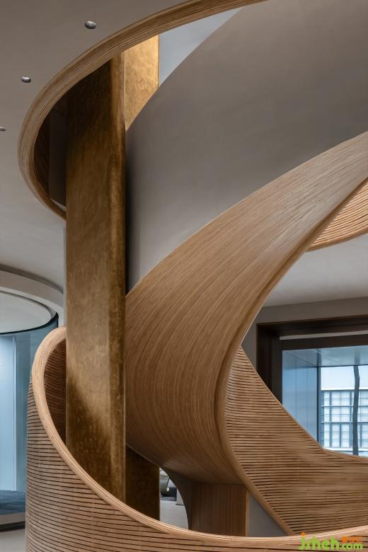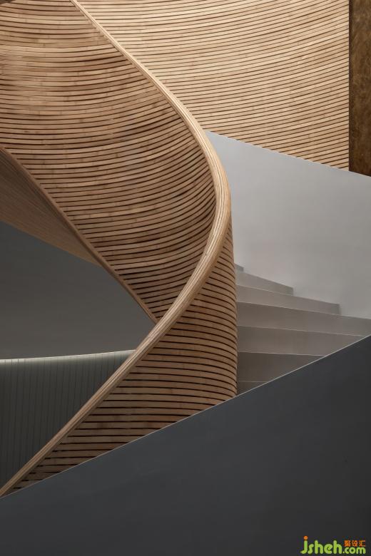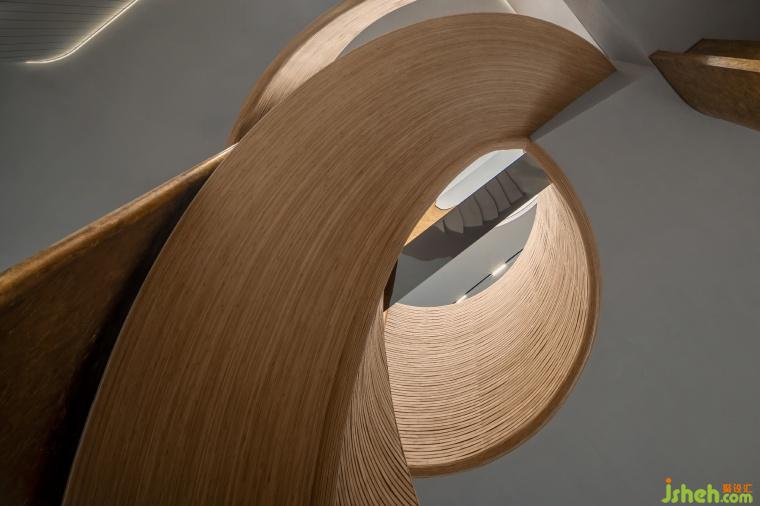 辦公室設(shè)計細(xì)竹木編織而成的接待前臺猶如掀起的巨浪,繼續(xù)纏繞著旋轉(zhuǎn)樓梯,如漩渦一般,蜿蜒攀升至二樓。