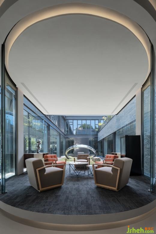 建筑中嵌套了一個內(nèi)院,內(nèi)院的大玻璃結(jié)構(gòu)設(shè)計將自然的天光引入室內(nèi),圍繞內(nèi)院形成了內(nèi)部的一個洄游動線。