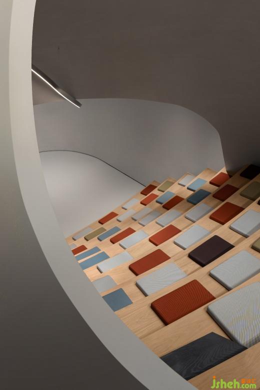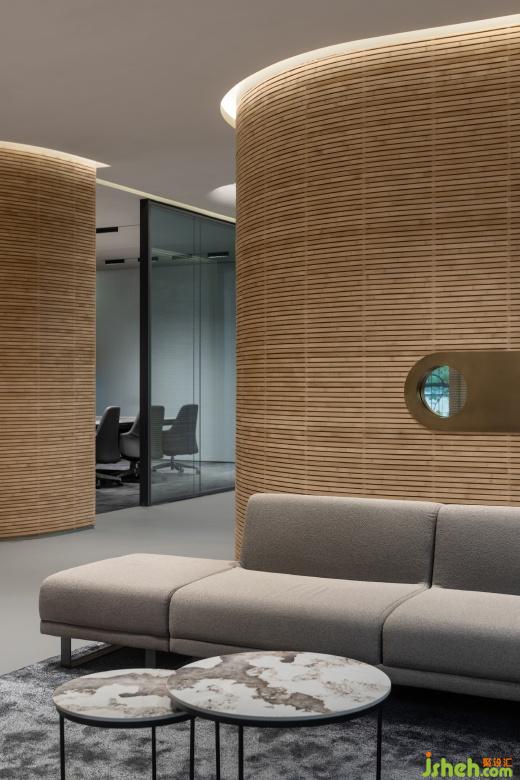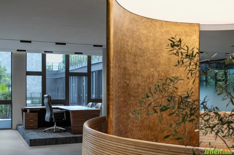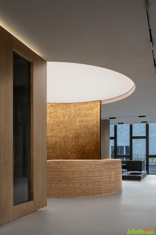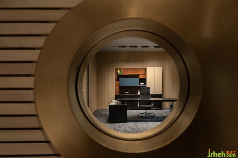 懸挑出的端頭布置的辦公室兼具了辦公與中型會(huì)議功能,屋內(nèi)的灰鏡吊頂放大了空間縱向上的高度,現(xiàn)代感的材料也為空間賦予了幾分冷冽的權(quán)威之感。