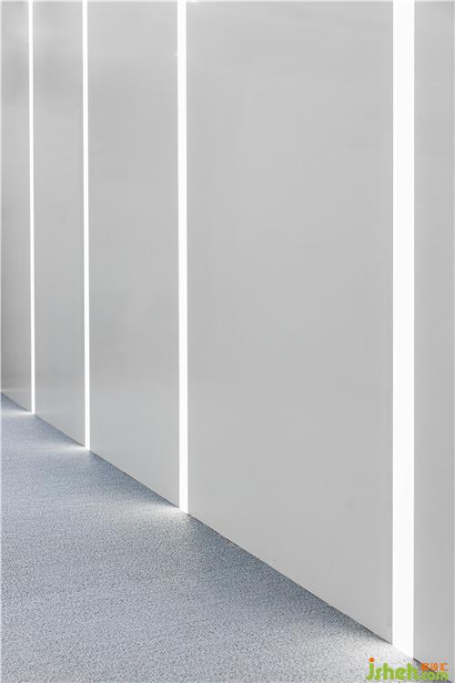 ▼走廊背景為灰色背漆玻璃,頂部細(xì)長(zhǎng)的燈帶增加縱深感