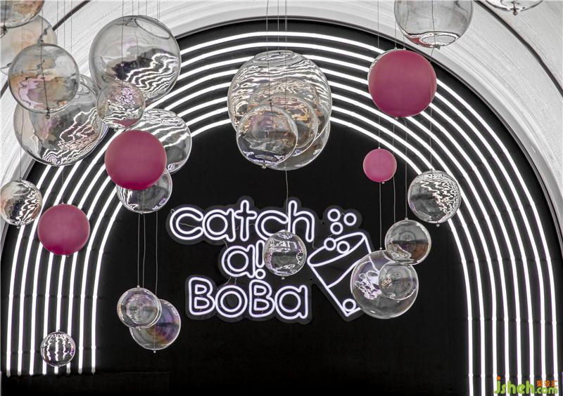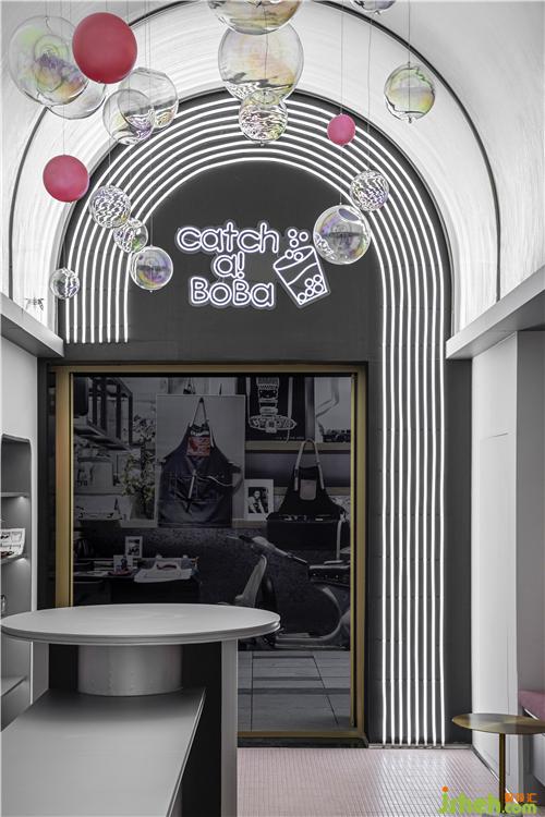 整體的室內(nèi)外標(biāo)識設(shè)計(jì)成為空間設(shè)計(jì)中的重要構(gòu)成元素,我們重新設(shè)計(jì)了catch a boba的logo,并在logo的外側(cè)增加了巨大的奶茶吸管元素,奶茶店設(shè)計(jì)圓形的吸管又與發(fā)光的穹頂互相融合成為穹頂?shù)氖湛凇?