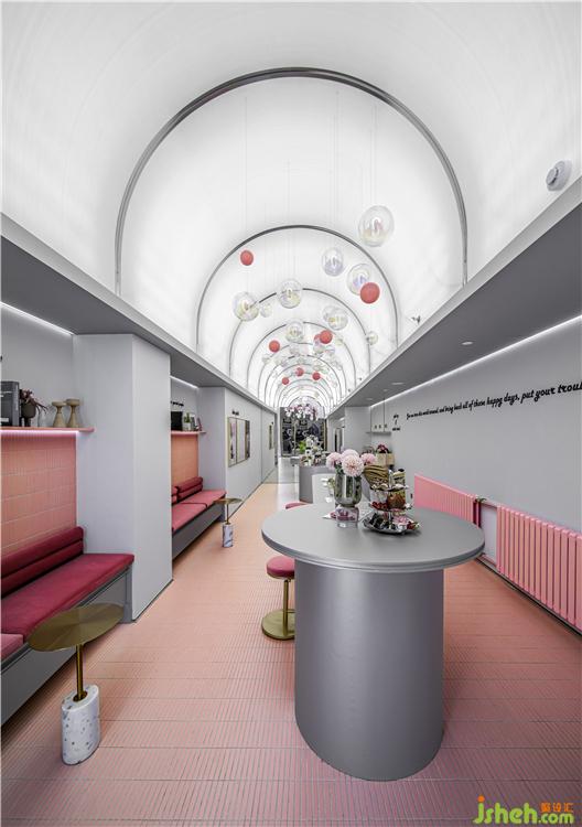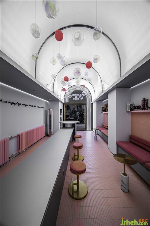 奶茶店設(shè)計(jì)為了凸顯夸張尺度的層高,我們在原始結(jié)構(gòu)中加入了通長的穹頂;同時(shí)在穹頂?shù)谋M頭設(shè)計(jì)完整的鏡面箱體,使得空間呈現(xiàn)出兩倍的長度。讓高的更高,讓長的更長。
