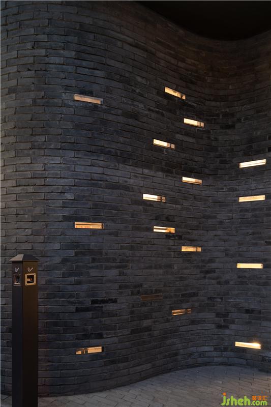 建筑外立面在材質(zhì)上使用青磚,順延整個胡同古樸的氣質(zhì),主入口處采用柔和的弧線處理形式,形成一個具有進深感的入口等候區(qū),同時又兼顧兼顧引導(dǎo)客流的作用。為了更加凸顯入口的弧度,我們使用了新材料——玻璃磚,給原本古樸的青石磚添加了幾筆通透的色彩,在夜晚能夠給昏暗的胡同點起幾盞明亮的燈。