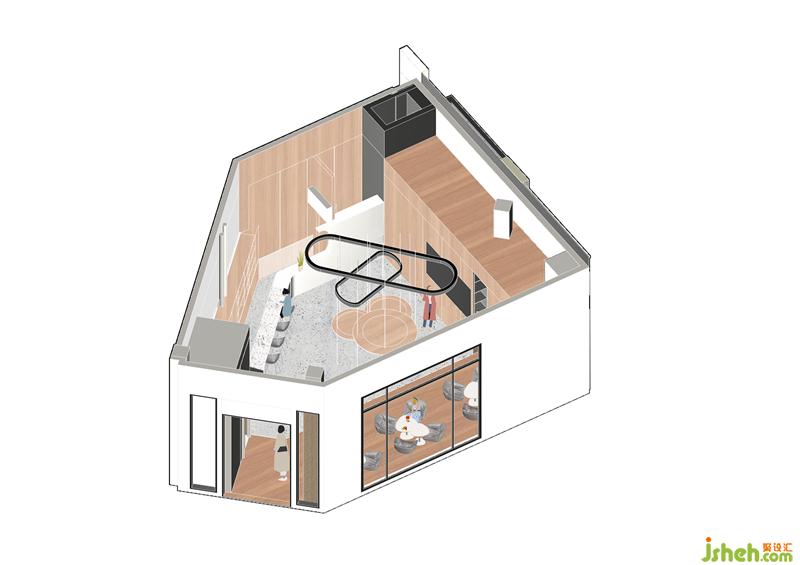 咖啡廳的整體設(shè)計(jì)嘗試將不同的功能獨(dú)立出來(lái),并加以強(qiáng)調(diào)。入口處圍合成一個(gè)半遮半掩的木質(zhì)盒子,夜間透過(guò)暖色燈光引起路人的探索欲,步入門廳的過(guò)程可以透過(guò)一側(cè)通透的展示格與休閑區(qū)產(chǎn)生視線交匯,通過(guò)門廳后整個(gè)咖啡廳的核心空間便豁然展現(xiàn)在眼前。展示區(qū)域集中在中心,成為整個(gè)咖啡廳的視線焦點(diǎn)。入口接待區(qū)設(shè)計(jì)將石質(zhì)服務(wù)臺(tái)和木質(zhì)吧臺(tái)聯(lián)系為一體,形成了一個(gè)嵌入墻壁的木盒,強(qiáng)調(diào)整體的同時(shí)模糊了展示區(qū)和吧臺(tái)區(qū)的界限??Х葟d裝修設(shè)計(jì)盡頭衛(wèi)生間作為一個(gè)獨(dú)立的單元體被隱藏起來(lái),并做暗門處理,使墻壁沿線的整體性得到保證。
