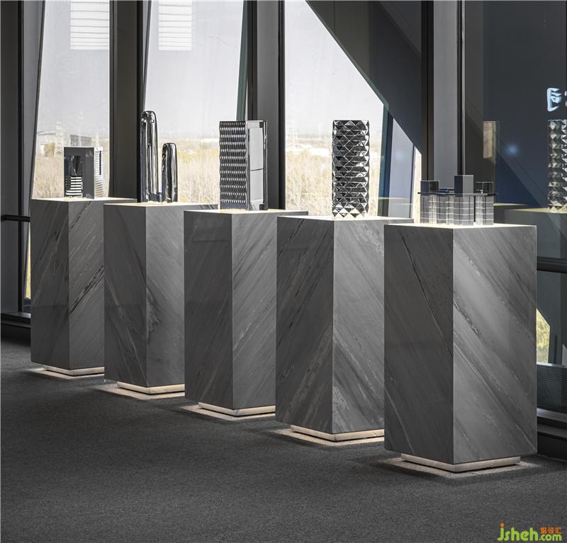 From the light curtain into the front area, the whole space presents a simple and gray sense. In addition to the necessary reception functions of the reception area, a group of display areas are also set up here. In May 2000, Poly Group rescued the three National Treasures of the Old Summer Palace-Bull Head, Monkey Head and Tiger Head-bronze statues that were plundered by foreign powers more than 100 years ago, and returned to China, which aroused widespread acclaim at home and abroad and inspired the patriotic enthusiasm of Chinese. On the side of the reception area, there are four bronze beast heads from the Old Summer Palace collected by Poly Group. These artistic treasures are also a symbol of the light of national culture.