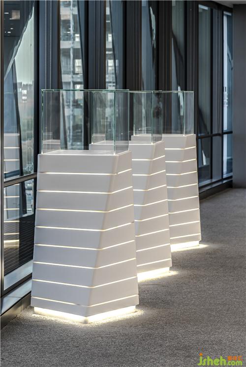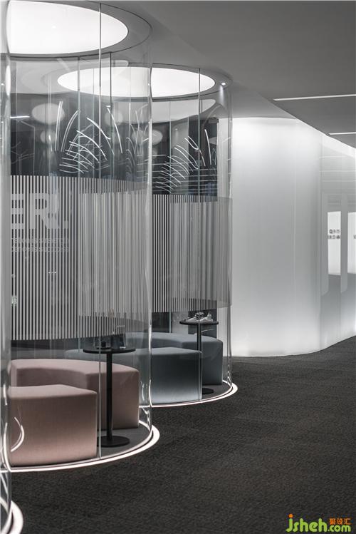 通過不同形式的光構(gòu)成的展示區(qū)域,我們下一站就來到了這個(gè)似乎可以將“光”具像化的空間。在這里,設(shè)計(jì)了五個(gè)通透的圓柱形玻璃體,北京辦公室設(shè)計(jì)頂部配以發(fā)光燈膜,讓光線均勻的灑在每一個(gè)玻璃體內(nèi),形成一種通透的光感。人們在這五個(gè)空間中,可以近距離的觸摸光,感受光。