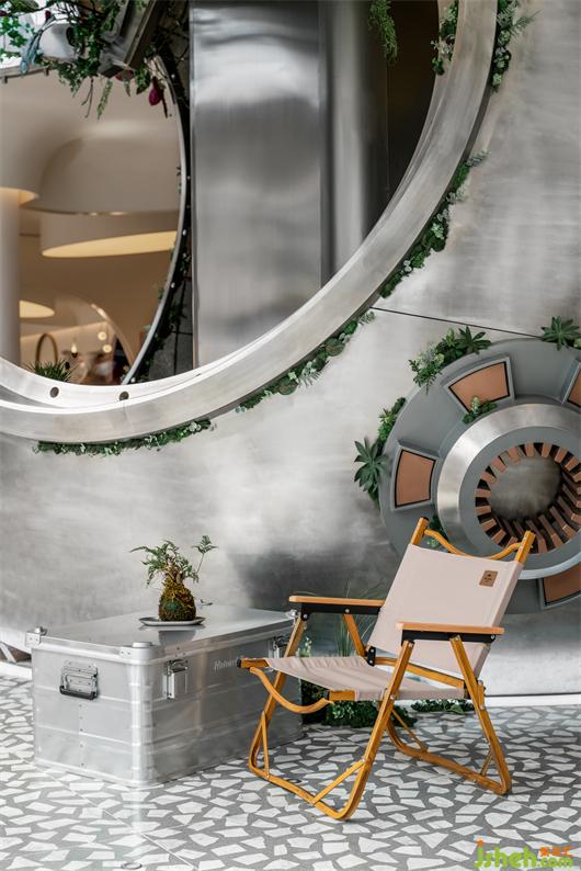 咖啡操作臺是由廢舊的艙體演變而來,在經(jīng)過打磨后,它似乎又煥然一新了。機艙蓋的燈光使整個咖啡操作區(qū)域變得明亮,也增添了一絲神秘的色彩。周邊是在廢墟上自然生長的植被。