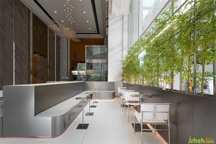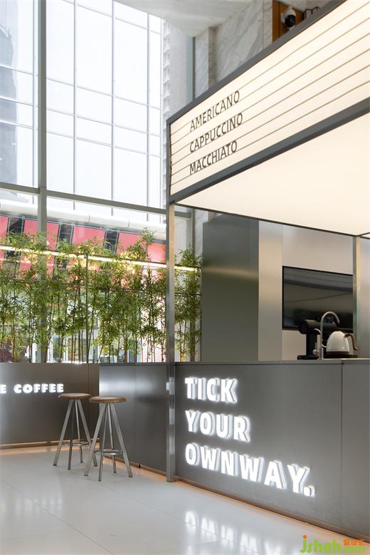 本店的客群主體是匯錦金融中心是工作的人,設(shè)計(jì)希望為他們提供一個(gè)工作間隙與好友放松聊天會(huì)客的場(chǎng)所——“城市會(huì)客廳”。設(shè)計(jì)師通過咖啡吧臺(tái)方盒子與Ticle品牌標(biāo)識(shí)字母“T”空間穿插組合,圍合成品牌標(biāo)識(shí)字母“T”從人視角看是咖啡會(huì)客區(qū),從大堂高層向下眺望會(huì)是平躺的字母“T”,從多種視線角度展示品牌形象。