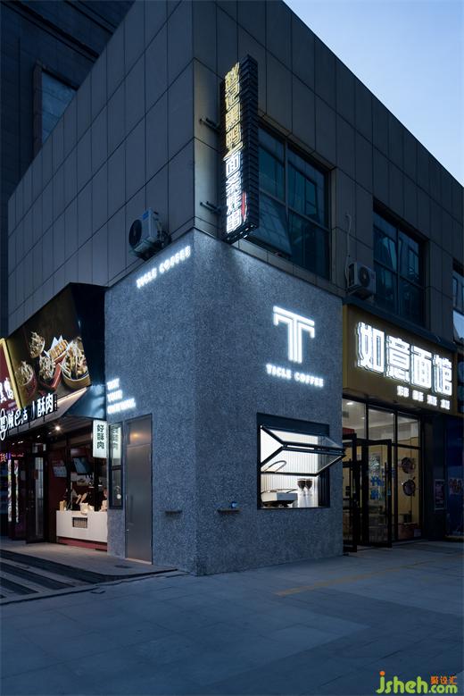 l 窗口內(nèi)采用原色不銹鋼金屬、波浪板、頂面采用發(fā)光燈膜,COFFEE設(shè)計整體空間純粹、明亮與深色水刷石外立面形成鮮明對比。