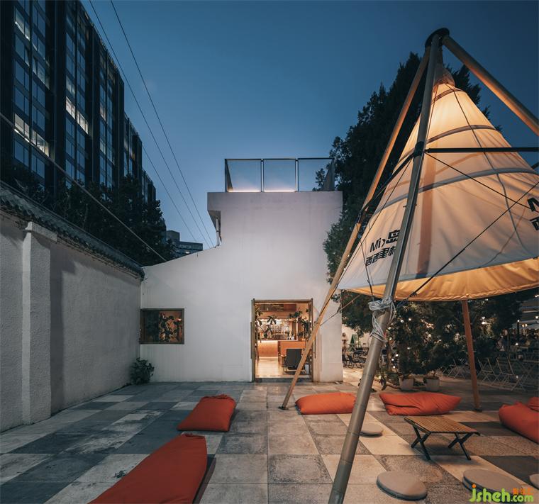 ▼溫暖的色調和柔和的燈光營造夜幕下戶外席地而坐的場地,Warm tones and soft lighting create an outdoor seating area at night