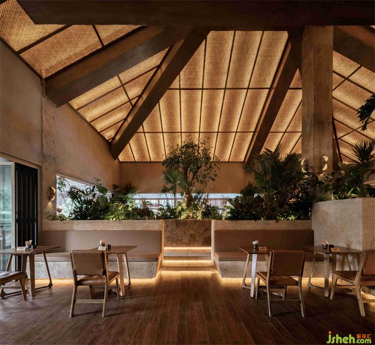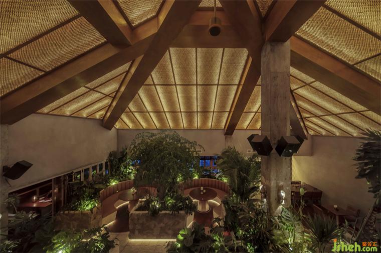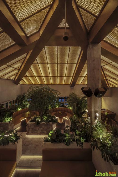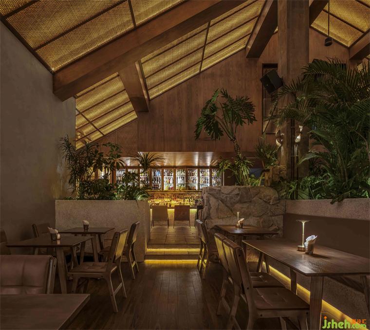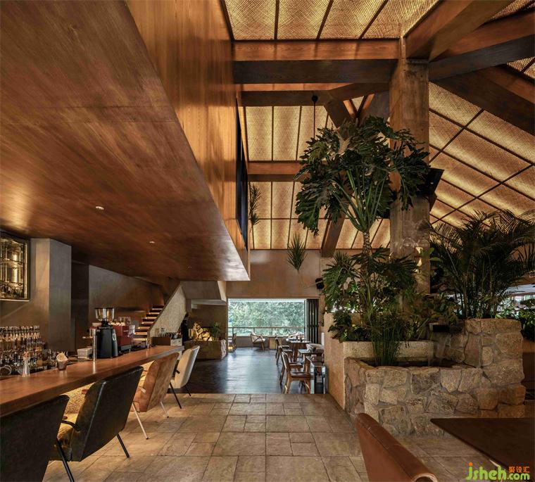 屋頂和燈光的形狀和設(shè)計(jì)靈感來(lái)自充滿異域風(fēng)情亞熱帶的傳統(tǒng)建筑, 酒吧餐廳設(shè)計(jì)從主樓外部樓梯進(jìn)入酒吧內(nèi)部,可見(jiàn)屋頂通過(guò)木結(jié)構(gòu)的連接,傳統(tǒng)的藤條編織手藝與燈條結(jié)合,具備半透明性和“輕”的狀態(tài),便捷地固定在原建筑的結(jié)構(gòu)上,從而大大降低了建造的成本和時(shí)間。通高大廳中央由裸露的鋼檁條支撐的木制梁依靠撐起,巨柱在垂直向度上暗示結(jié)構(gòu)構(gòu)件的受力和空間在高度上的方向感。中部隔斷以大量高低不一層次分明的綠植和石材肌理打造,梁柱保留原始肌理裸露感,維持了建筑原有的特點(diǎn);燈條貼于地面,起到引導(dǎo)作用,地面使用石材與木地板的結(jié)合,不同的鋪裝對(duì)應(yīng)不同的動(dòng)線和空間使用區(qū)域。