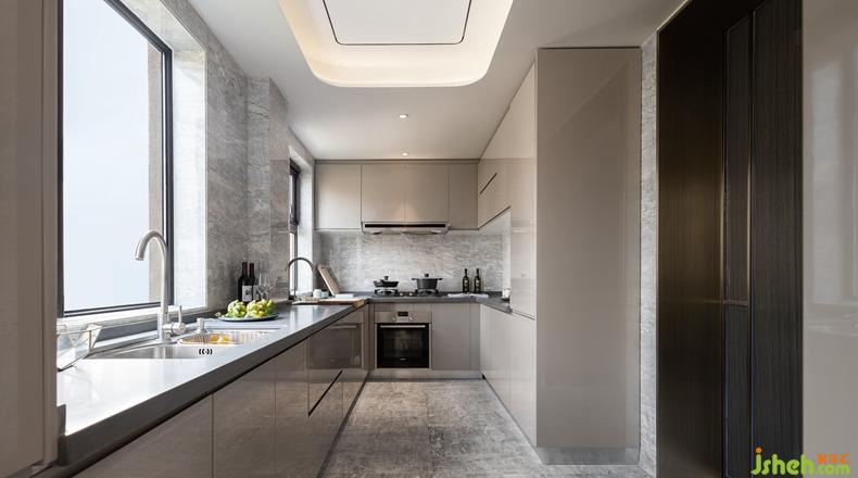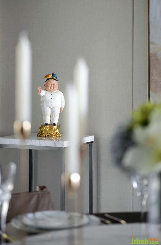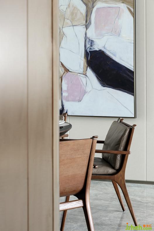 餐廳儲(chǔ)物柜加粗豎向線條分割大空間,細(xì)化直線構(gòu)造出三維層次感,對(duì)應(yīng)墻面的巖石抽象藝術(shù)畫,實(shí)用性與藝術(shù)觀賞性俱佳。