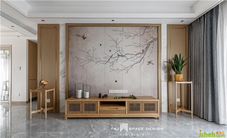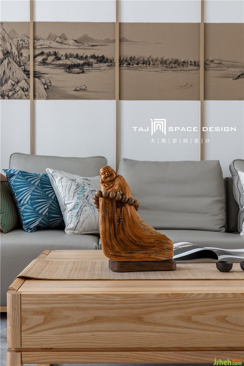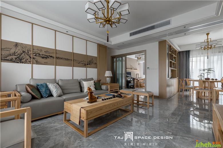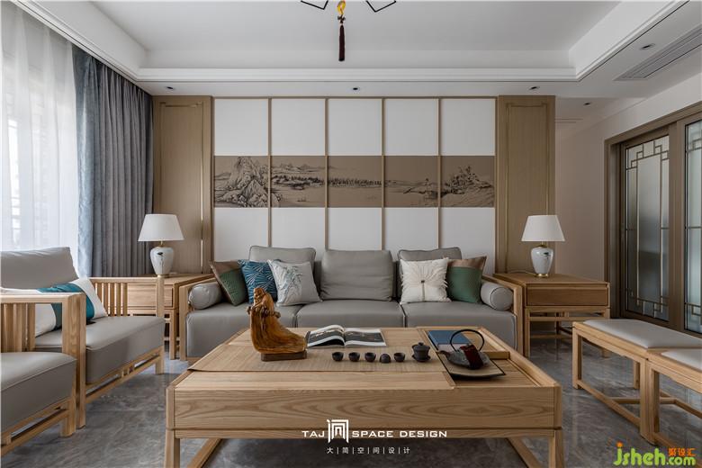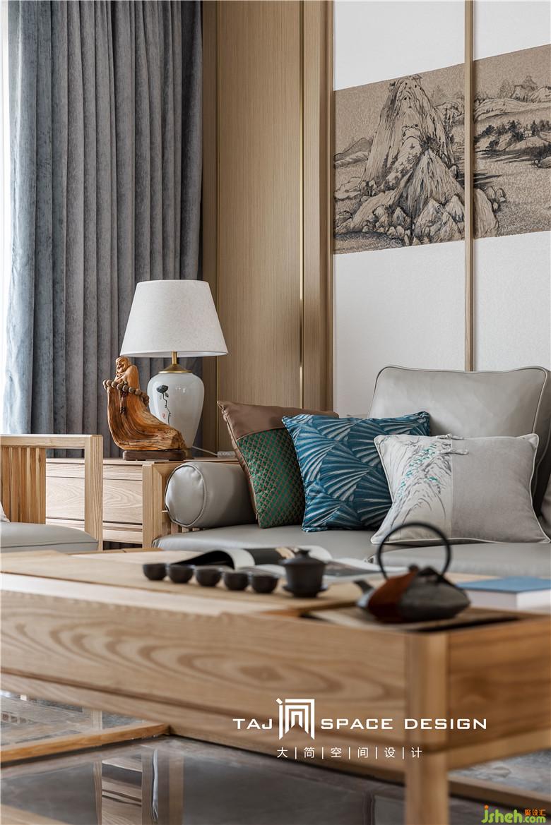 室內(nèi)設(shè)計師在客廳背景墻上運(yùn)用山水畫為點(diǎn)綴。山映云景,水接人家。設(shè)計師執(zhí)筆作畫,方寸間勾勒出空間中的小細(xì)節(jié)與詩情畫意。