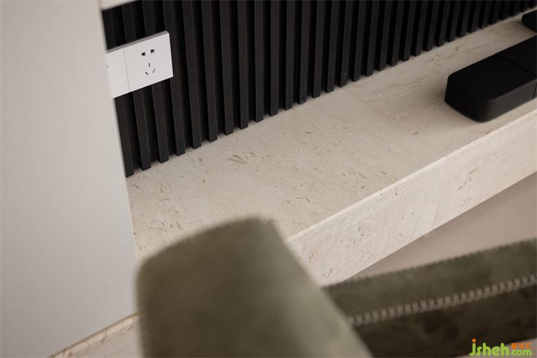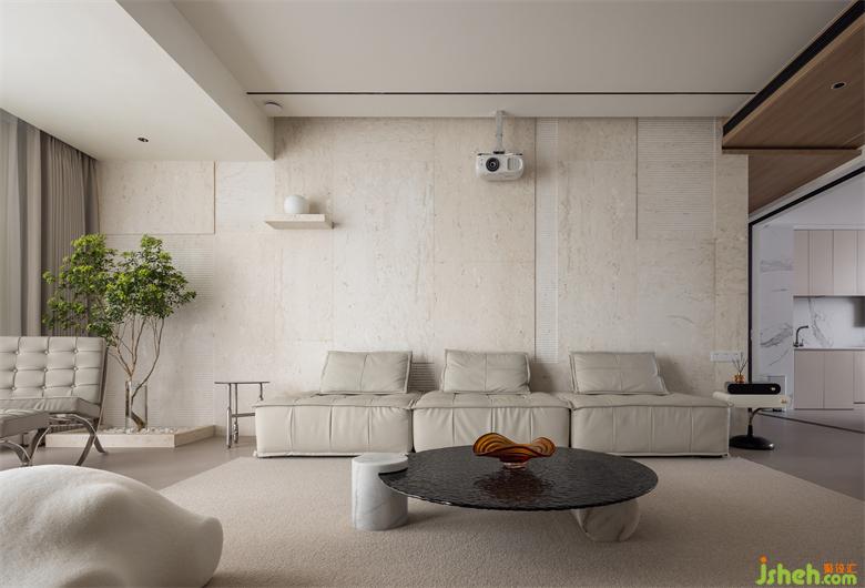 不規(guī)則的洞石背景是客廳的一大亮點,展現(xiàn)天然材質的本質美,與米白色的藝術墻漆相輔相成,澄凈而溫柔,淡化都市與自然的界限。