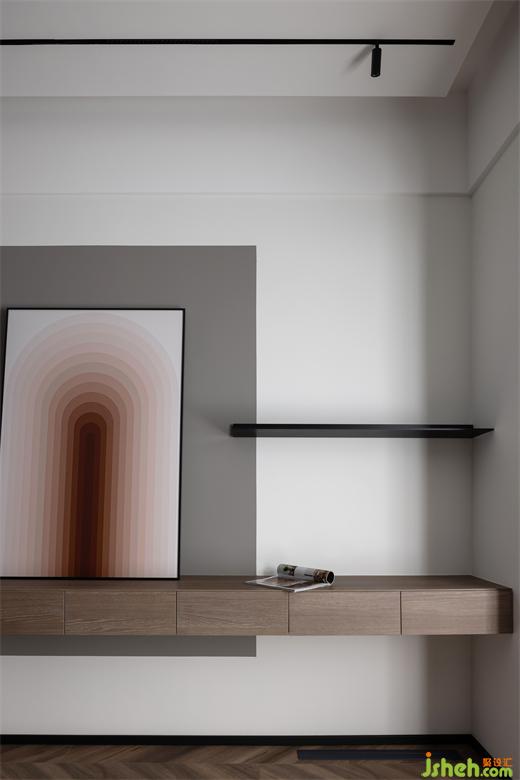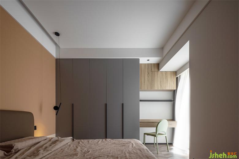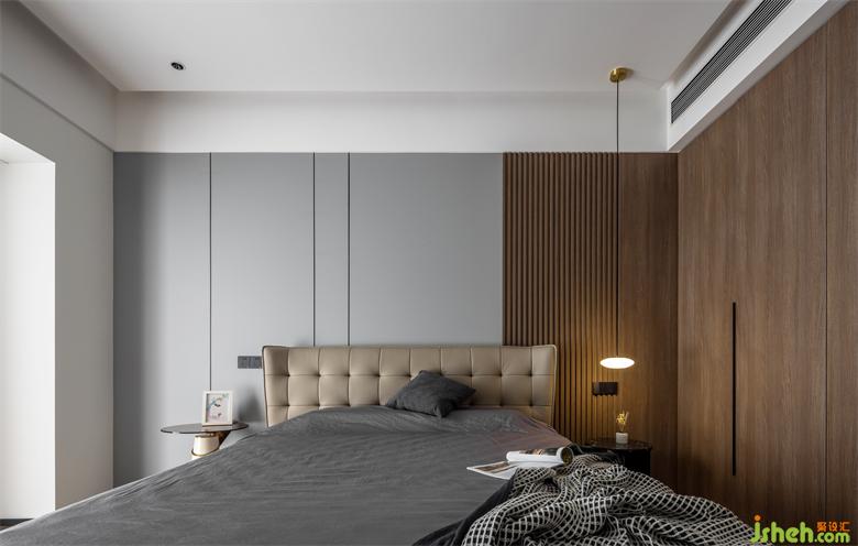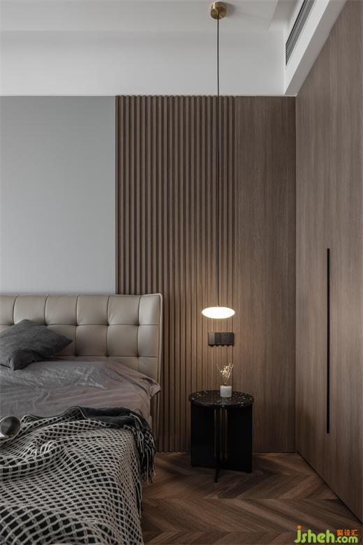 主臥內(nèi)斂灰色和胡桃木在規(guī)整中相互映襯靜謐的空間節(jié)奏加上藝術(shù)化的展示,設(shè)計(jì)師試圖通過純粹的視覺感官