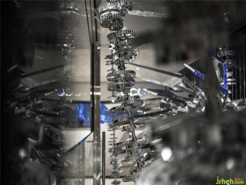 鋼材的反射強(qiáng)調(diào)裝置的輕盈與靈透,截然不同的材質(zhì)與感受碰撞出矛盾質(zhì)感,彌合出整體空間的框架與戲劇性。