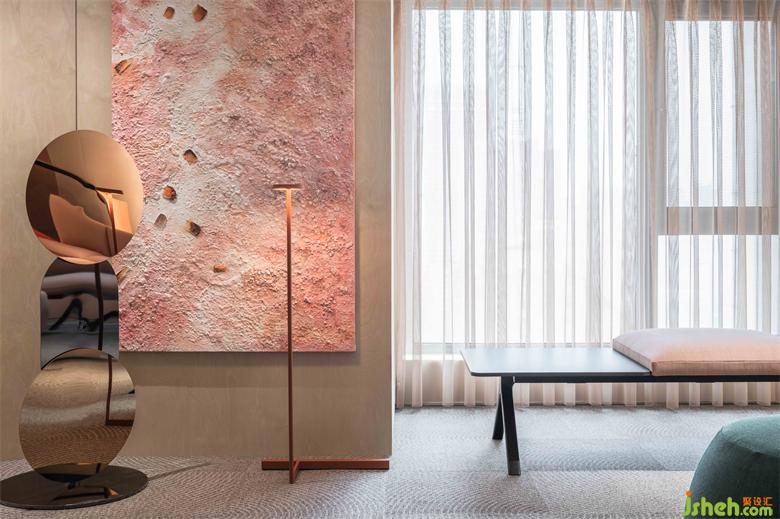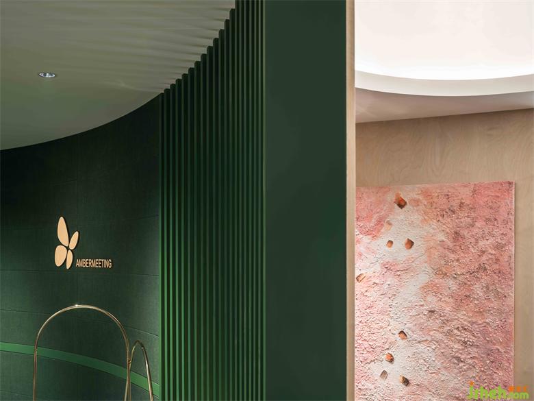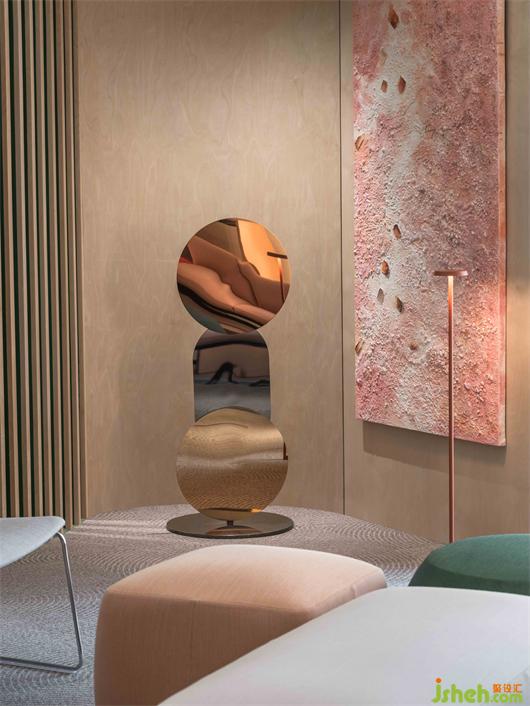 空間中肆意揮灑的綠色、粗礪質(zhì)感的墻面天花、地毯上像漣漪又如年輪的紋樣,大地藝術(shù)的精髓展現(xiàn)其間。