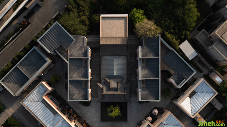 方正格物,既保留了傳統(tǒng)中式建筑中尖頂飛檐,又以板材梳理并替換了層層的琉璃瓦片。火鍋店設計將傳統(tǒng)與當代并置,以簡潔的語義玩味并回歸傳統(tǒng)文化之核心?,F(xiàn)古典中正之意、安靜閑散、不容擁喧。設計師以一方洞天引樹木入館,使其“館中生樹,林中有館”,風搖庭樹,回歸自然。