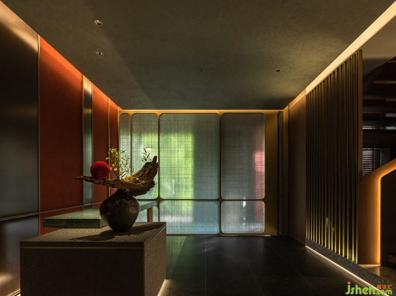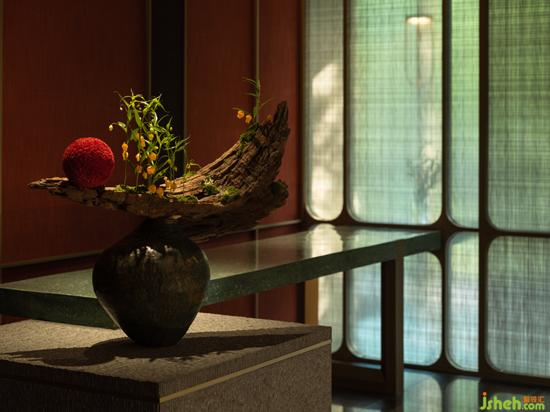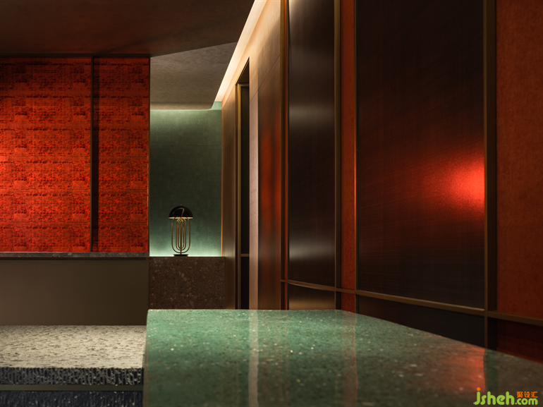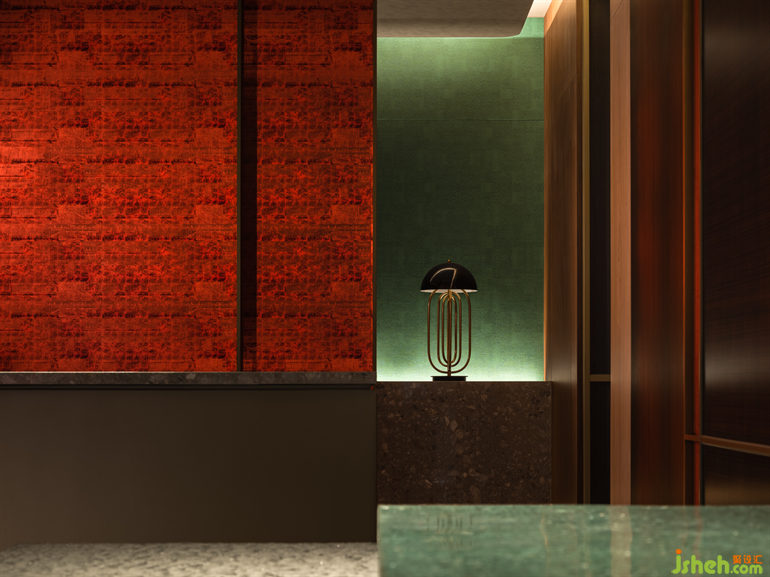 朱紅與翠綠、奢華與簡約、陽剛與陰柔,巧妙地營造了美的張力與平衡力。設計師以自然景觀為基礎,再現(xiàn)了李唐文化中兼容并蓄、濃麗熱烈的一面。