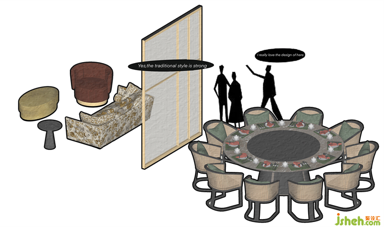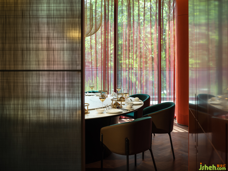 包廂延續(xù)了新古典浪漫主義,厚重的隔斷與紗帳,帶來夢里看花的朦朧美感?;疱伒暝O計師以材料、色彩、器物、藝術等諸多方面入手,為現(xiàn)場營造出精致、優(yōu)雅、奢華的氛圍感。